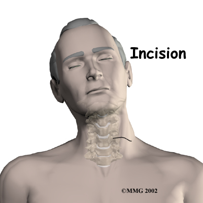 The patient's neck is positioned facing the ceiling with the head bent back and slightly to the right. A two-inch is made two to three fingers' width above the collar bone across the left-hand side of the neck. Surgeons often choose the left side to avoid injuring the nerve going to the voice box. Retractors are used to gently separate and hold the neck muscles and soft tissues apart so the surgeon can work on the front of the spine.